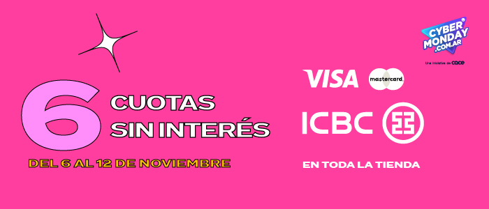 Propuesta para cartera de consumo valida en la republica argentina. Desde el 06/11/2023 hasta el 12/11/2023. 6 cuotas sin interés con tarjetas de crédito visan y mastercard icbc. No acumulable con otras promociones. No valido para compras efectuadas por mercado pago, todo pago, pago inmediato, o pago entre personas. No valido para compras mayoristas ni para tarjetas visa business, visa distribución, visa purchasing, visa purchasing campo, corporate, corporate signature, recargable empresa y visa cuenta central. No valido para clientes que posean como único producto caja de ahorro en pesos en icbc. El plan en cuotas tiene tasa nominal anual 0,00%, tasa efectiva anual 0,00%, costo financiero total nominal anual (cftna) 0,00%. Solo para clientes que se encuentren al día en sus productos. Industrial and comercial bank of china (argentina) s.a.u. es una sociedad anónima unipersonal bajo la ley argentina. Su accionista limita su responsabilidad al capital aportado. (ley 25738).